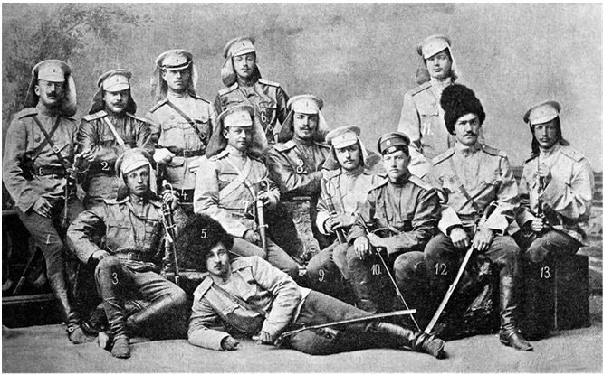 Вот одна из них. Кто-то сидит на диванчике, кто-то присел на тумбочки, небрежно задрапированные материей. Несколько человек стоят, один прилег. За ними – стена ателье с нарисованными полями и редкими деревцами. Все уже при оружии: вперед выставлены грозные драгунские шашки. Всего мы видим 13 человек. Они пронумерованы. Под фото перечислены фамилии, однако, не обошлось без ошибок: тут и опечатки, и инициалы указаны далеко не у всех, а три персоны, как я докажу, и вовсе перепутаны. Приведу детальный анализ фотографии.