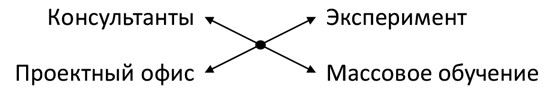 Универсальная механика теоретически есть, но на практике решение, по какому пути пойти, как правило, принимает руководитель, основываясь на собственном опыте и своих убеждениях. Можно сформулировать типовые сценарии таких внедрений: «Консультанты», «Эксперимент», «Проектный офис», «Массовое обучение».
