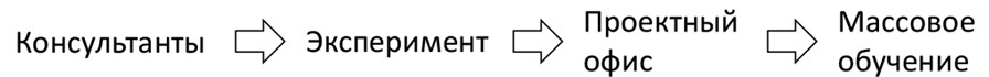 Существует также сценарий «Консультанты – массовое обучение – распределенный проектный офис». Он сложнее, требует сильной вовлеченности руководителя, постановки конкретных целей и высокого уровня проектной дисциплины.