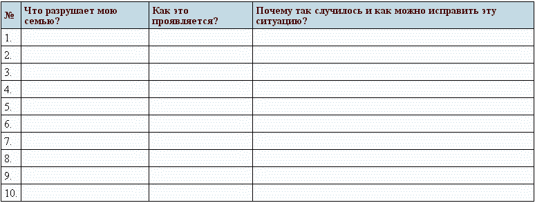 ЗаданиеЧто вы считаете главными разрушителями семьи? Выпишите 10 основных проблем/задач и расставьте их по степени опасности.