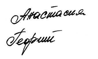 Буквы не сильно отличаются по размеру – это говорит о том, что девушка скромная, без особых претензий к окружающим. Некоторые буквы крупноватые, что характеризует ее как мечтательную, наивную и доверчивую, но этот показатель не критичен – возможно, это проявляется в какие-то определенные периоды или с конкретными людьми. На всех этапах прослеживаются мягкость и отсутствие раздражения. Об этом говорит вся подпись: мягкие, плавные буквы, соединения.