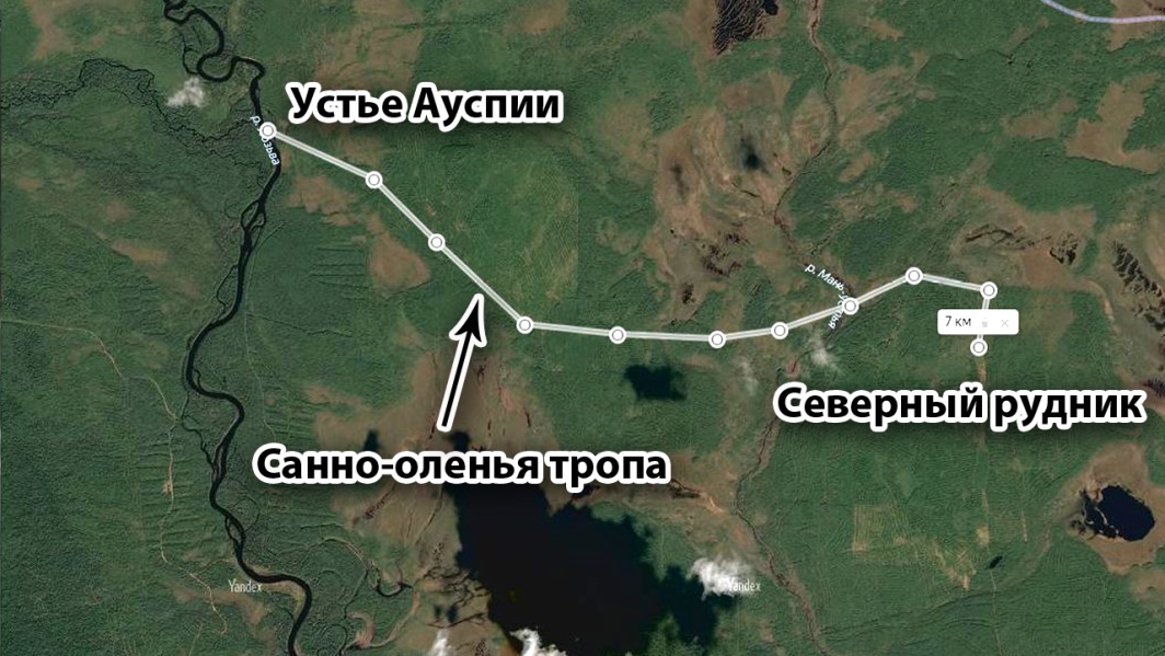 Исходя из радиограммы, поселок находился в 6-10 км от устья Ауспии. И хоть Неволин не указал название населённого пункта, и так было понятно, что речь идёт о Северном руднике, так как других посёлков в том районе не наблюдалось. Сопоставив все имеющиеся факты, я приступил к поиску Северного рудника. И нашел лишь одно место на картах, которое полностью соответствовало, имеющейся информации. Это высота 297 (296.4). Она находилась, примерно в 7 км от устья Ауспии, если двигаться по оленье-санной тропе, которая имеется на старых картах. К тому же, исходя из современных спутниковых карт, была видна заброшенная дорога от 2-го Северного рудника до этой высоты.