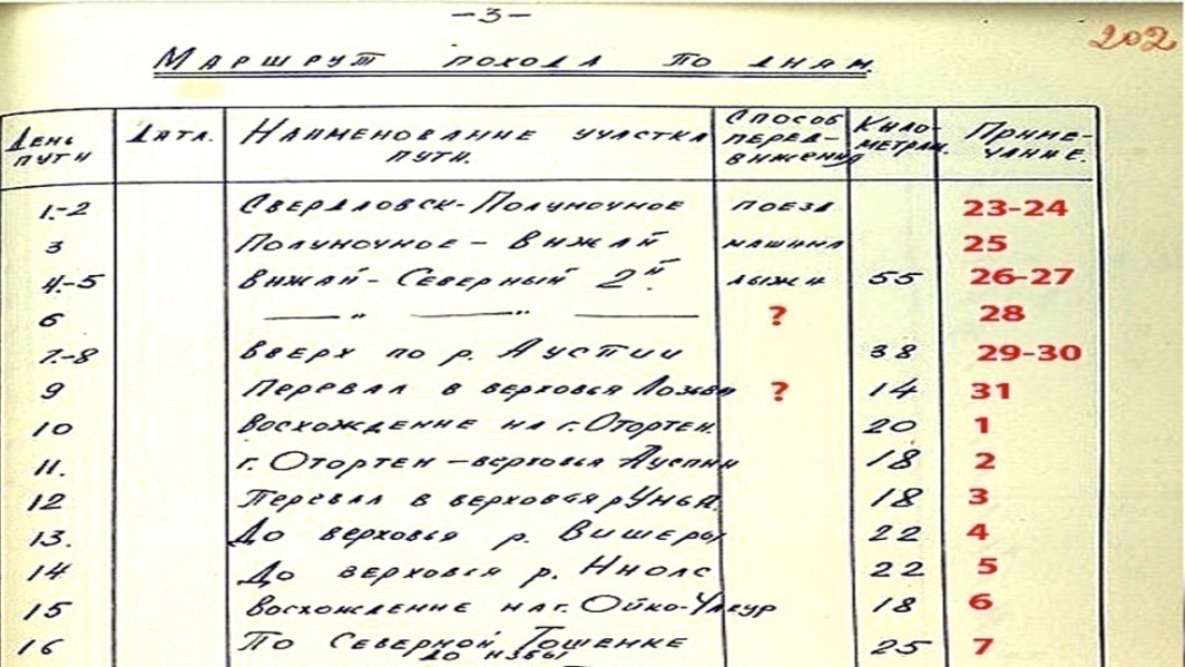 После того как был найден поселок Северный рудник, можно было приступать к разбору очень важного документа, каким, несомненно, являлся "Маршрут похода по дням", составленный студентом Уральского Политехнического Института Дятловым Игорем Алексеевечем, ещё в декабре 1958 года. А там было что разбирать, так как проложенный маршрут в этом документе не соответствовал действительности по ряду причин. И именно Северный рудник, всё расставлял на свои места. Но обо всём по порядку.