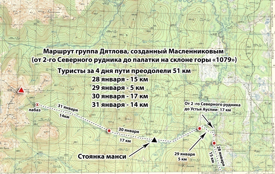 Получается интересная история. Исходя, из записи в тетради, туристы за 29 и 30 января, прошли вверх по Ауспии, 30 км. А на допросе за эти же дни всего 22 км, из которых 2 км по Лозьве. То есть на 10 км меньше. Что выглядит очень странно. Но ещё удивительней расстояние пройденное туристами за 28 января, вообще 31 км. Интересно, откуда появилась такая странная информация, которая всё ставит с ног на голову. Ведь известно, что от 2-го Северного рудника до Ауспии, 17 км.