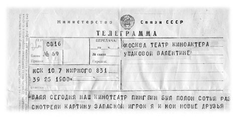 Особым успехом пользовались комедии и фильмы про любовь. В одном из них главную роль играла актриса Валентина Ушакова. С ней отец учился в одно время на параллельных курсах в Институте кинематографии. Однажды он решился и отправил в Москву телеграмму: «Валя! Сегодня наш кинотеатр “Пингвин” был полон. В сотый раз смотрели “Запасного игрока”»… Актриса ответила, завязалась переписка.
