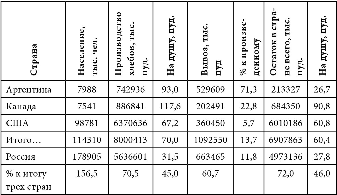 Далее Бразоль лжет про сельское хозяйство: «В 1913 году в России урожай главных злаков был на 1/3 выше такового же Аргентины, Канады и Соед. Штатов вместе взятых».