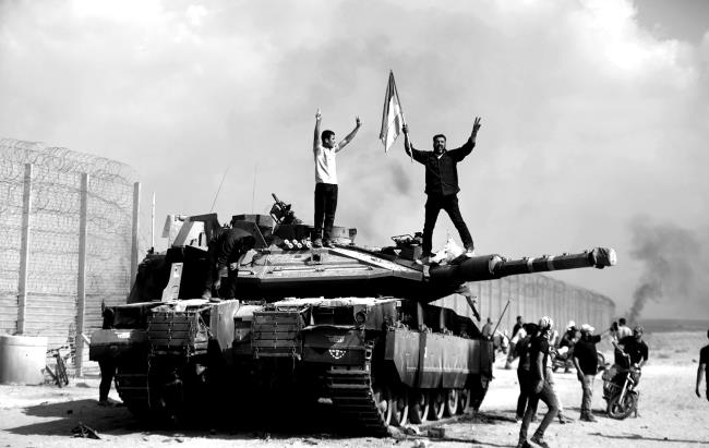 Палестинские бойцы на захваченном израильском танке