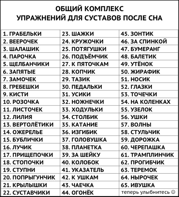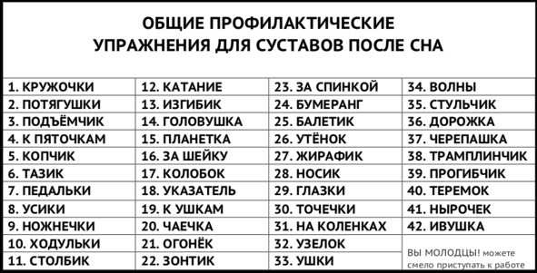 Необходимый функциональный минимум упражнений для суставов после сна рекомендуется выполнять, в том числе, как после непродолжительного дневного отдыха, так и перед тем, как встать ночью в туалет или попить воды.