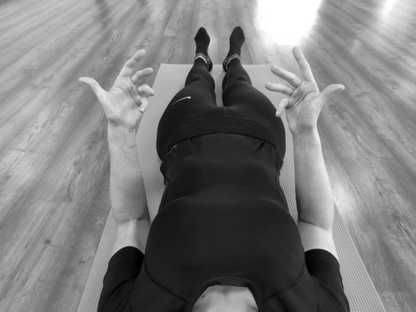 Исходное положение: лёжа на спине, руки приподняты над животом, пальцы обеих рук сложены между собой, соприкасаясь в области средних суставов (проксимальных межфаланговых суставов); в данной композиции участвуют все пальцы, кроме больших, отведённых в стороны, перпендикулярно ладоням.