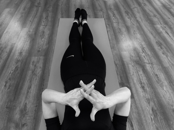 Исходное положение: лёжа на спине, руки приподняты над животом, пальцы обеих кистей сложены между собой, соприкасаясь в области средних фаланг (проксимальных межфаланговых суставов); прямые большие пальцы рук соприкасаются подушечками между собой.