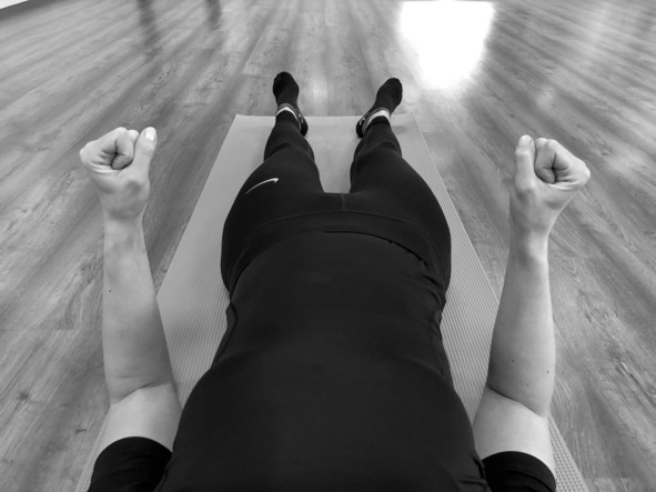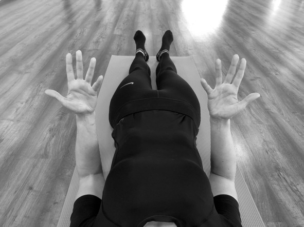Исходное положение: лёжа на спине, руки приподняты над животом, большой палец правой руки отведён в сторону, ладонь левой руки наложена на большой палец правой руки сверху него.