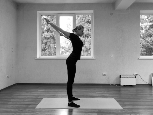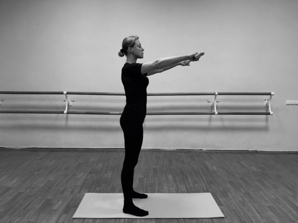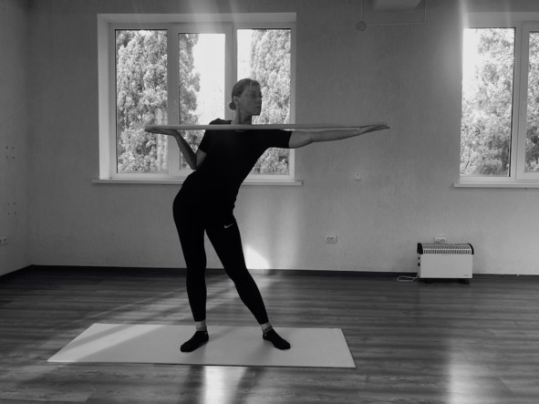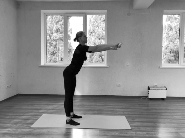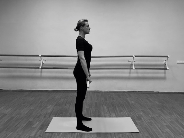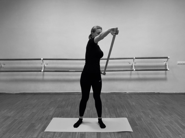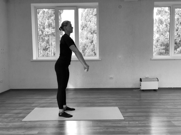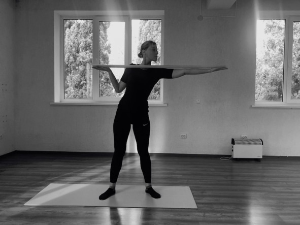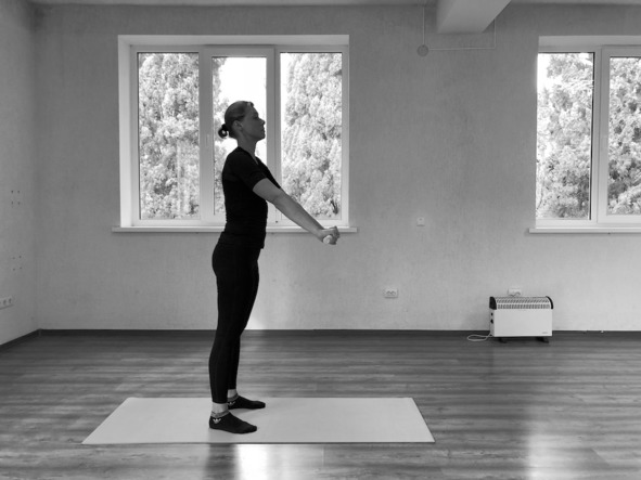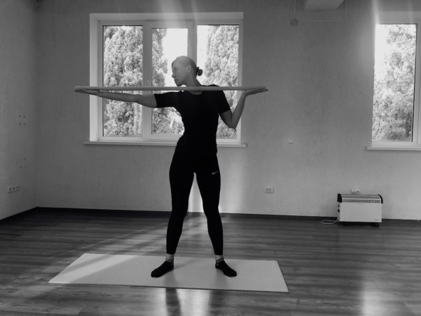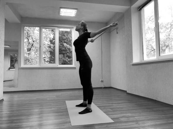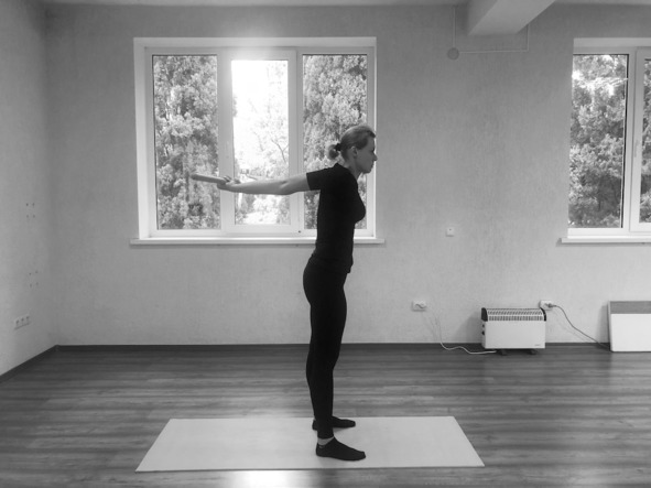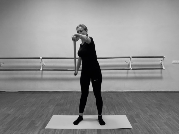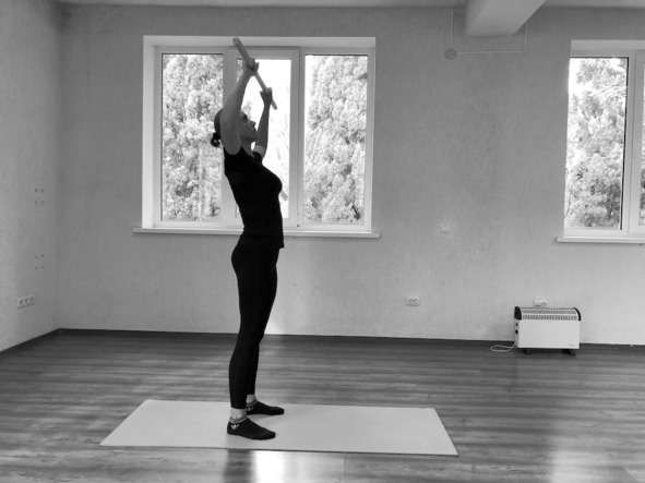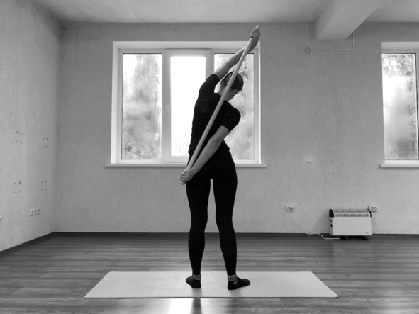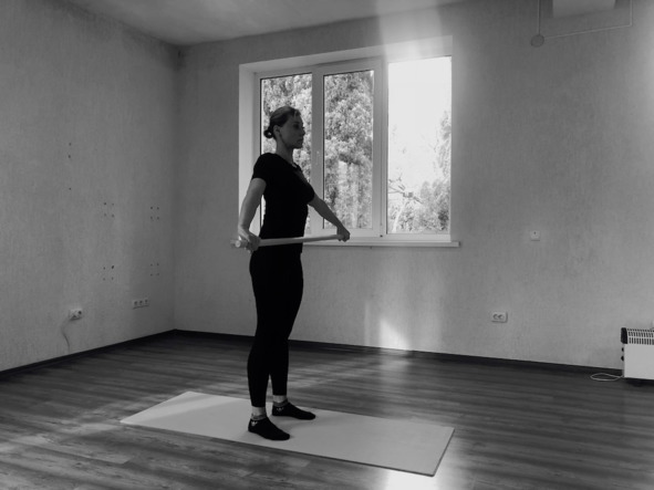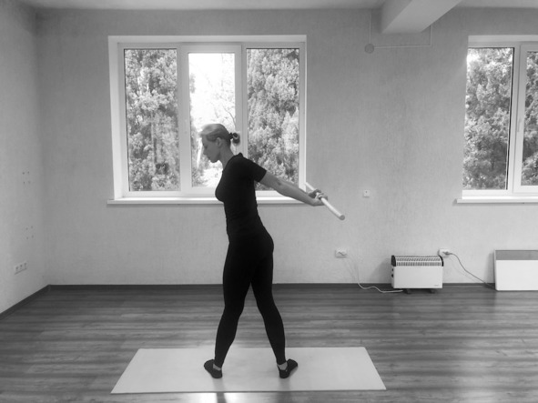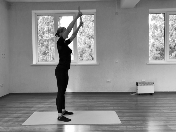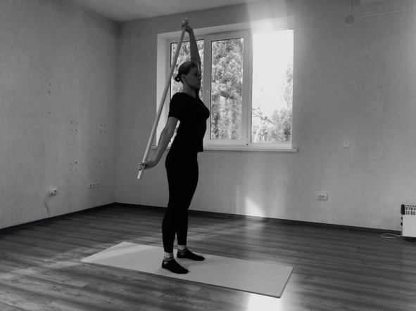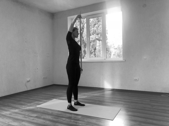 Техника выполнения: поднимаем виргу максимально вверх за спиной и фиксируем её в данном положении, приняв его за нижний уровень (положение 1). Выполняем короткие рывковые движения руками вверх из положения 1 и обратно (рывки). Движения резкие. 20 повторений. Далее, из положения 1 выполняем повороты туловища влево и вправо, стопы не отрываются от пола. Движения плавные. 10 повторений.