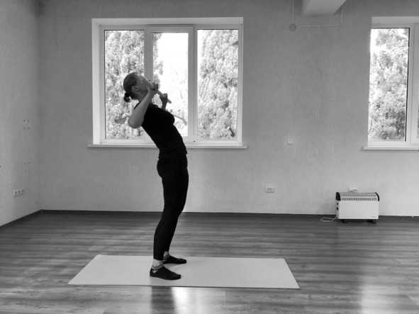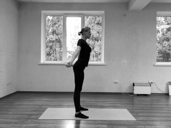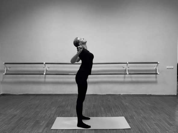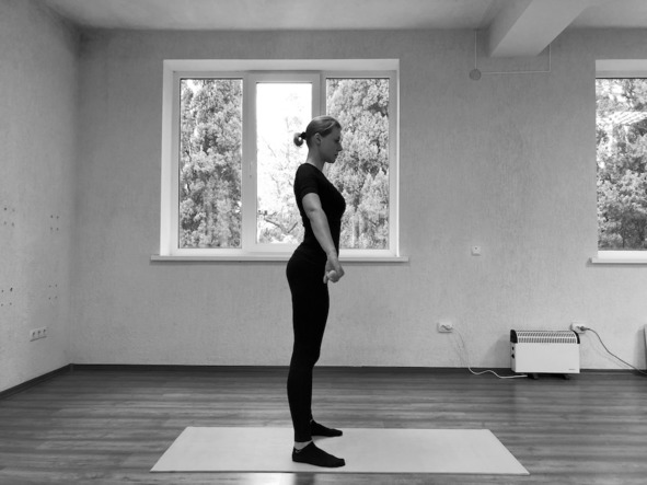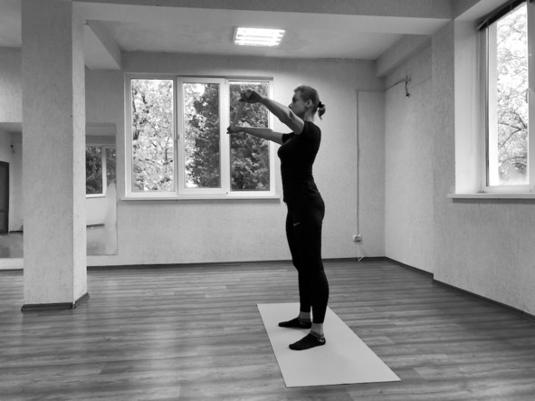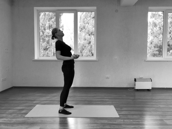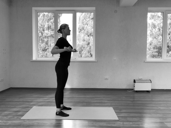 Техника выполнения: поднимаем виргу вверх и тянем её к потолку, а плечи к ушам (визуально подымается вверх область плеч) (движение 1) в течение 5 секунд. Возвращаемся в исходное положение. 5 повторений.