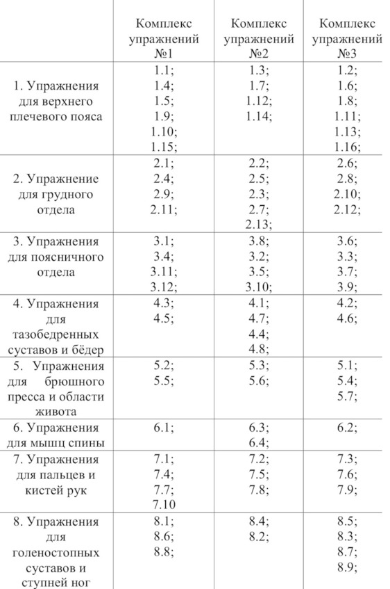 К примеру, Вы хотите найти в книге упражнение К Солнцу. Сначала, в таблице с указанием названий упражнений, Вы находите место расположения искомого упражнения (К Солнцу): Комплекс 1, упражнение №4 (по порядковому номеру сверху вниз). Далее, во второй таблице с указанием числовых обозначений упражнений Вы находите Комплекс упражнений №1 и смотрите числовое обозначение четвёртого упражнения сверху (4 – порядковый номер упражнения в первой таблице), которое и соответствует его названию. В данном случае упражнение К Солнцу имеет числовое обозначение 1.9, обозначающее в свою очередь следующее: раздел 1 (Упражнения для верхнего плечевого пояса), порядковый номер упражнения в разделе – 9 (1.9. Упражнение 9) (стр. 36). Аналогично осуществляйте поиск и других нужных Вам упражнений.