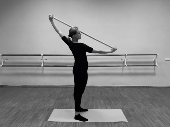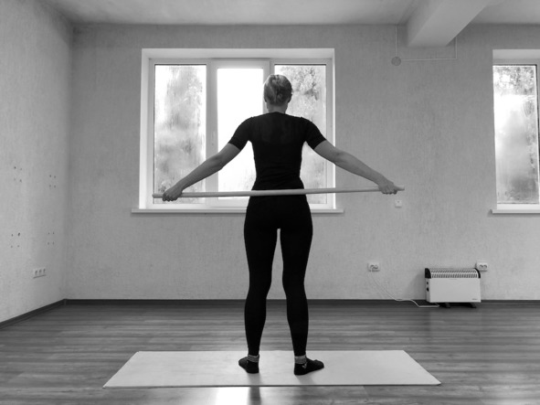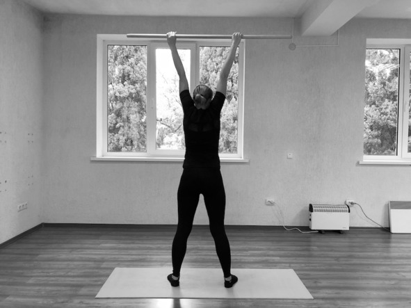 Техника выполнения: заводим виргу за голову прямыми руками, раскрывая грудную клетку, задерживаем на уровне лопаток на несколько секунд и опускаем затем на поясницу прямыми руками (движение 1). Голова при этом поднята вверх. Возвращаем виргу прямыми руками в исходное положение. Постепенно сужаем руки до среднего хвата. Движения плавные. 5 повторений.