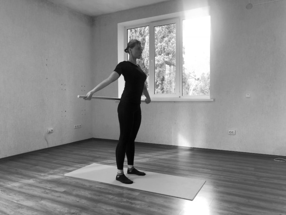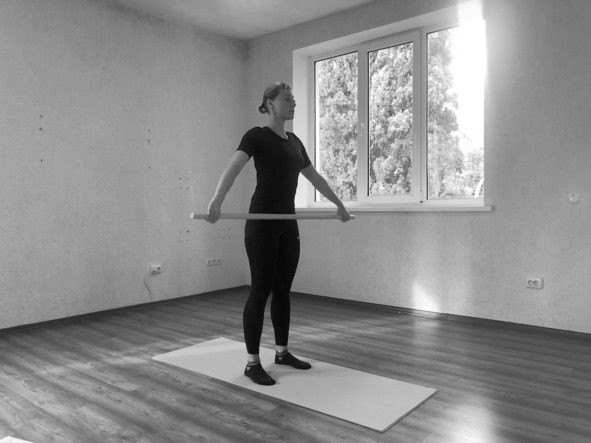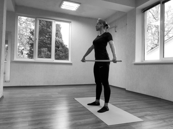 Исходное положение: стоя, ноги на ширине плеч, вирга перед собой на уровне шеи лежит на раскрытых ладонях, хват средний.