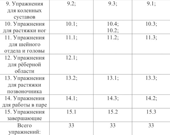 Последовательность выполнения упражнений при выполнении какого-либо из трёх комплексов по 33 упражнения каждый, следует определить для себя индивидуально, в зависимости от ваших особенностей и предпочтений.