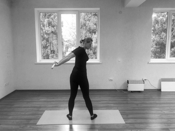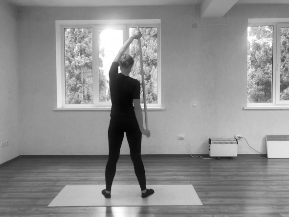 Техника выполнения: наклоняем туловище вправо и ведём виргу прямой правой рукой влево вверх, подымая левую руку и растягивая её в плечевом суставе, а также растягивая левую боковую поверхность туловища. Шея расслаблена, голова опущена вправо. В верхнем положении выполняем давление правой рукой на левую снизу вверх в течение 5 секунд (движение 1). Возвращаемся в исходное положение. Наклоняем туловище влево и ведём левую руку с виргой вправо вверх, подымая правую руку (движение 2). Движения плавные. 6 повторений.