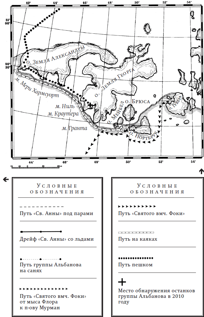 СХЕМА МАРШРУТА ГРУППЫ АЛЬБАНОВА ПО ОСТРОВАМ ЗЕМЛИ ФРАНЦА-ИОСИФА (ИЮНЬ–ИЮЛЬ 1914)