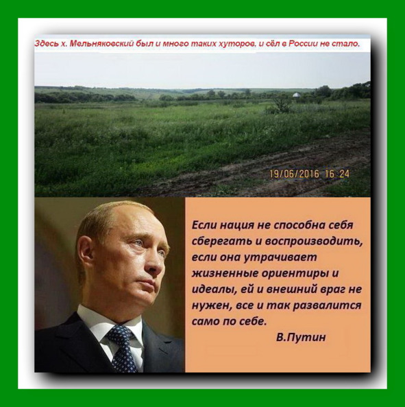 Бывалчик в 1970-тые года!Процветали донские хутора…В какой хутор не заедешь,Все работали как веер.Пахали, сеяли, убирали!Мал и стар там работали…В гос закрома зерно ссыпали,Молоко парное не попивали.Малым поросятам его выливали…Они с молока быстрей вырастали!Чтоб было мясо для страны…Мясо не завозили из Европы.Поголовья было столь тогда,Что нечем кормить было иногда…Сейчас поедешь по хуторам,Боже мой… какой развал!Кое-где, куреня ещё стоят,Пустотой на приезжих глядят…Вот здесь Мельников жил,Вот здесь Арсенов был,Вот там Михайловы жили,Вот там Пристансковы были…Теперь на кладбищах лежат,А куреня пустые их стоят.Многих и куреней уже нет!Курганы напоминают их след…С таким подходом в стране,России не быть богатой на земле.Когда патриоты, страну поднимают,А враги народа, Родину разрушают…Где же наши спецслужбы бывают?Почему врагов народа не изобличаю???