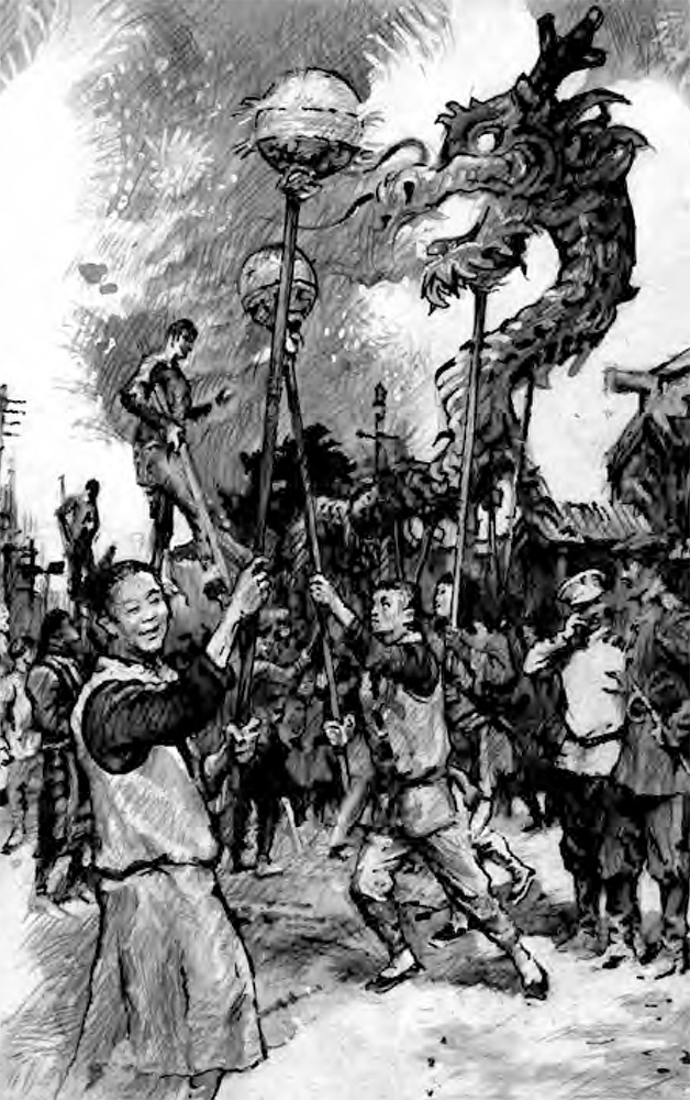 В самом деле, все участники представления взялись за руки и стали вокруг своего дракона. Раздались медленные, тянущиеся звуки рожков. Под эту музыку танцоры, притопывая, начали водить хоровод. Дракон лежал смирно, потом стал сперва пошевеливать то одной, то другой лапой (внутри его был скрыт один из актёров), потом поднял голову и отчаянно затряс ею. Темп музыки ускорился. Хоровод задвигался всё быстрее и быстрее, танцоры затянули заунывную песню. Чудовище, лежавшее на земле, мало-помалу начало просыпаться. Сначала оно ворочалось с боку на бок, потом вдруг поднялось на ноги. В это время перед ним появился красный фонарь – солнце. Это привело дракона в страшную ярость. Он стал кидаться на фонарь, сперва довольно спокойно и уверенно. Фонарь отодвигали, попытки дракона были безуспешны. Тогда он вдруг поднялся над толпой, весь светясь внутренними фонарями и резко выделяясь в наступившем сумраке ночи своими огненно-красными глазами и пастью. Шёпот одобрения пробежал по рядам зрителей. Благодаря скрытым приспособлениям дракон казался парящим в воздухе. С возрастающей яростью и проворством он начал гоняться за красным шаром, извиваясь всеми своими кольцами. Шар-солнце продолжал ускользать от него. Дракон свирепел. Он то взлетал, размахивая своим кольцом и трепеща громадным туловищем, то припадал к земле, расстилаясь по ней во всю свою длину. Хоровод кружился между тем со всё возрастающей и возрастающей скоростью, музыка ускоряла также свой темп, пение перешло в оглушительный крик. Зрители стояли как очарованные. Зрение их, восприняв необыкновенные эффекты, притупилось. Неумолкаемая какофония всяких звуков привела вместе с тем людей в состояние, близкое к гипнотическому. Русским солдатам казалось, что они присутствуют на шабаше ведьм, – так необычайно было для них всё происходившее перед их глазами. Музыка и пение начали стихать, но не сразу, а постепенно. Хоровод уже не кружился с прежней быстротой. Дракон также замедлял свои движения, чудовище устало… Ещё минута-другая, и он неподвижно распластался на земле, а прямо над ним, как бы торжествуя свою победу, появилось красное солнце-фонарь…