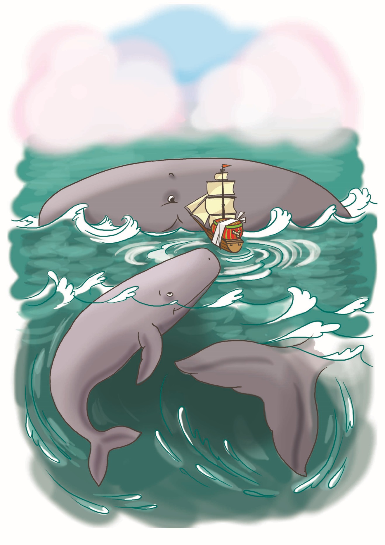 Ласковые китыКогда плывешь на север, то нужно быть готовым к тому, что море постоянно меняется. При отплытии море было спокойным, бирюзовым, ласковым. Но каждый день похода менял цвет моря, оно становилось все более темным и менее приветливым. Временами накатывала волна, и корабль, ведомый Стойким, лавируя, танцевал на самом гребне, а потом съезжал с волны. как с горки. Все, кроме самого Стойкого и Киска, не раз бывавшего в море, только ахали, преодолевая очередную волну.