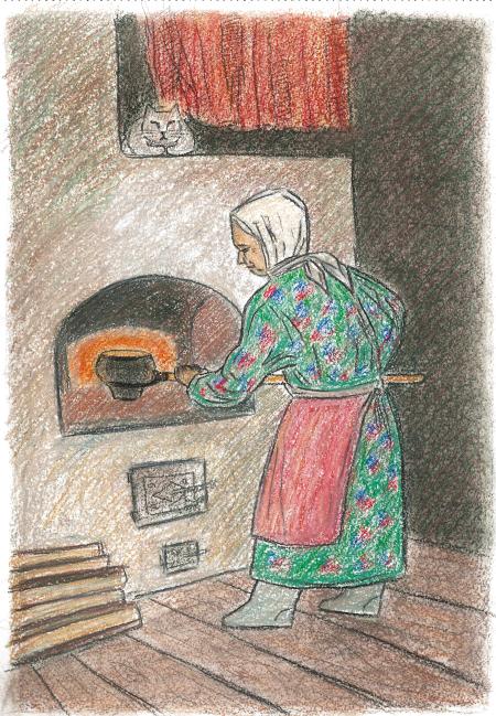 Она ухватом-рогачём[31] засунула чугунок с пшённой кашей в хайло[32] предварительно жарко протопленной русской печи, прикрыла его металлической заслонкой. Затем поставила ухват, кочергу для разгребания, ворошения углей и чаплю[33] в угол у печи. Устало опустилась на припечье[34] и уголком передника вытерла мокрое от пота худощавое смуглое лицо. Затем она, поправив сползший на голове платок, опустила на колени свои узловатые, натруженные загорелые руки с выпирающими венами. Я присел рядом с ней, немного помолчал, а потом спросил: