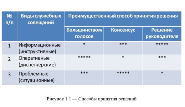 Основным результатом совещаний являются принятые на них управленческие решения. Это главное, чего следует добиваться от совещаний и о чем, случается, забывают и руководители, и исполнители. Обычно лицом, принимающим решение (ЛПР), является руководитель совещания, как правило, он же и возглавляет предприятие или его структурное подразделение. Участники совещания – руководители и сотрудники подчиненных уровней управления. Что касается оснований для принятия решений, то здесь можно отметить следующие варианты (Рис. 1.1):
