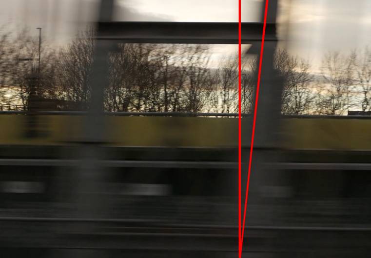 Cъемка «на ходу», из окна поезда. Столбы в реальности стоят вертикально.