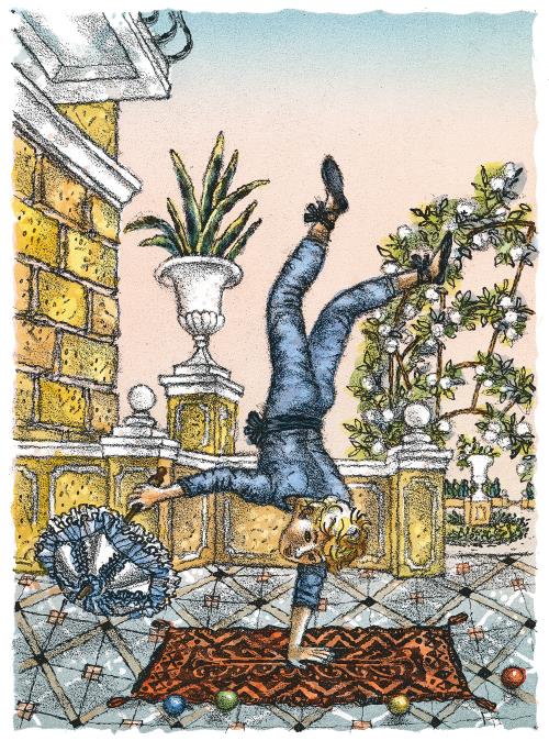 Дорожки сада были усыпаны ровным крупным гравием, хрустевшим под ногами, а с боков обставлены большими розовыми раковинами. На клумбах, над пестрым ковром из разноцветных трав, возвышались диковинные яркие цветы, от которых сладко благоухал воздух. В водоемах журчала и плескалась прозрачная вода; из красивых ваз, висевших в воздухе между деревьями, спускались гирляндами вниз вьющиеся растения, а перед домом, на мраморных столбах, стояли два блестящие зеркальные шара, в которых странствующая труппа отразилась вверх ногами, в смешном, изогнутом и растянутом виде.