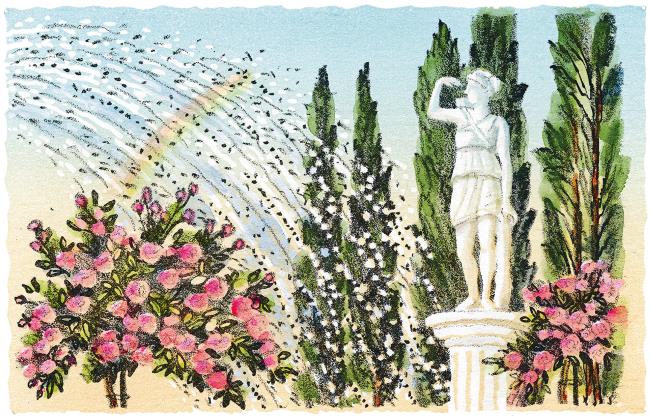 Таким образом старик с мальчиком и с собакой обошли весь дачный поселок и уже собирались сойти к морю. По левую сторону оставалась еще одна, последняя, дача. Ее не было видно из-за высокой белой стены, над которой, с той стороны, возвышался плотный строй тонких запыленных кипарисов, похожих на длинные черно-серые веретена. Только сквозь широкие чугунные ворота, похожие своей причудливой резьбой на кружево, можно было рассмотреть уголок свежего, точно зеленый яркий шелк, газона, круглые цветочные клумбы и вдали, на заднем плане, крытую сквозную аллею, всю обвитую густым виноградом. Посредине газона стоял садовник, поливавший из длинного рукава розы. Он прикрыл пальцем отверстие трубы, и от этого в фонтане бесчисленных брызг солнце играло всеми цветами радуги.