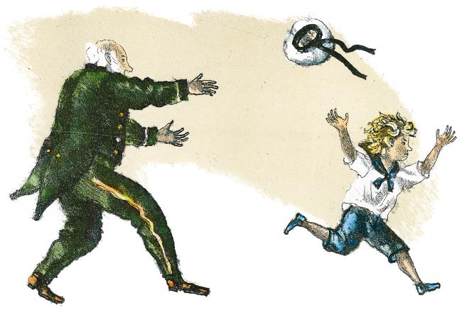 На террасу из внутренних комнат выскочил, как бомба, издавая пронзительные крики, мальчик лет восьми или десяти. Он был в легком матросском костюмчике, с обнаженными руками и голыми коленками. Белокурые волосы, все в крупных локонах, растрепались у него небрежно по плечам. Следом за мальчиком выбежало еще шесть человек: две женщины в фартуках; старый толстый лакей во фраке, без усов и без бороды, но с длинными седыми бакенбардами; сухопарая, рыжая, красноносая девица в синем клетчатом платье; молодая, болезненного вида, но очень красивая дама в кружевном голубом капоте, и, наконец, толстый лысый господин в чесунчовой паре и в золотых очках. Все они были сильно встревожены, махали руками, говорили громко и даже толкали друг друга. Сразу можно было догадаться, что причиной их беспокойства является мальчик в матросском костюме, так внезапно вылетевший на террасу.