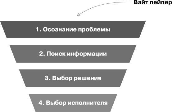 Но по большому счету все это – формальные признаки, которые могут только запутать. Для того чтобы полностью понять, что же такое вайт пейпер и чем он отличается от других схожих маркетинговых материалов, нужно четко определить область его применения. Если в качестве шкалы взять классическую воронку принятия решения (осознание проблемы, поиск информации, выбор решения, выбор исполнителя), место вайт пейпера – на самом первом этапе.