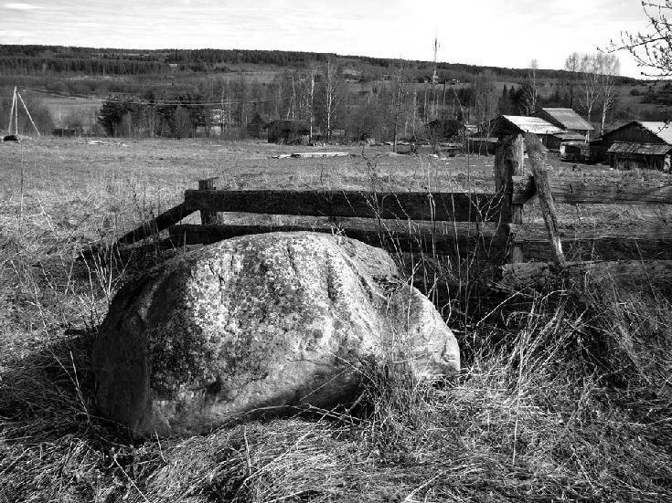 Старая часть деревни Власьевская расположена внизу крутого склона огромного холма, поэтому огороды одного порядка домов лезут вверх, а огороды нижнего порядка расположились на ровной поверхности долины реки Уфтюги. Я обошёл все окрестности деревни в поисках каких-то следов дворца дьявола, но нашёл только несколько разрозненных больших камней (фото 6: © А. Кузнецов). Шесть больших валунов в два ряда обнаружить так и не удалось. Известно, что в годы советской власти, когда велось расширение контуров колхозных полей, тяжёлые камни убирали с помощью техники и свозили в кучи на межах. Часть больших камней ушла на фундаменты строящихся домов, скотных дворов и телятников. Следы дворца дьявола в Верховье затерялись, но, может быть, кто-то из местных жителей ещё помнит, где находилось это место? Встаёт также закономерный вопрос: почему черти для своего обитания выбрали именно Уфтюгское Верховье? Их не испугало даже присутствие поблизости церковного погоста, храмы которого возвышались как раз посредине между деревнями Слудка и Власьевская! При этом дворец дьявола, Чёртов камень и православный погост размещаются в округе всего в 2 версты. Е. Л. Березович из Екатеринбурга в одной из своих публикаций по топонимике проанализировала многие «чёртовы» географические названия и пришла к выводу, что чаще всего они появлялись где-то на окраинах обжитых территорий [17]