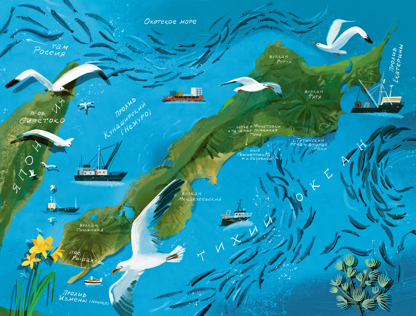 Но, конечно, главное богатство – морские шельфы площадью почти как три Московские области. Благодаря явлению апвеллинга воды здесь богаты планктоном. Сюда на откорм устремляются несметные стада сайры, анчоуса, сардин, ставрид, трески, палтуса, корюшки и прочих рыб. Кроме того, Курилы – это нерест лососевых с самыми значительными уловами в России. Это также десятки видов моллюсков, креветки, крабы, морские ежи, трепанги… И здесь же крупнейшие в России запасы ценных водорослей – от морской капусты до агароносной анфельции, добыча которой когда-то была крупнейшей в мире!