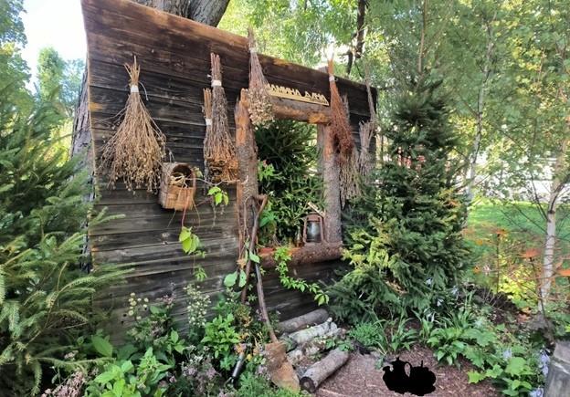 В качестве декора в сказочном лесу присутствуют садовые фигуры или элементы быта колдуньи: пучки трав на сушке, сундучки, ступа… Может быть и ручей или водоем. Декор подскажет нам