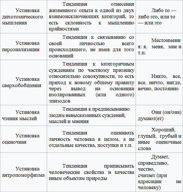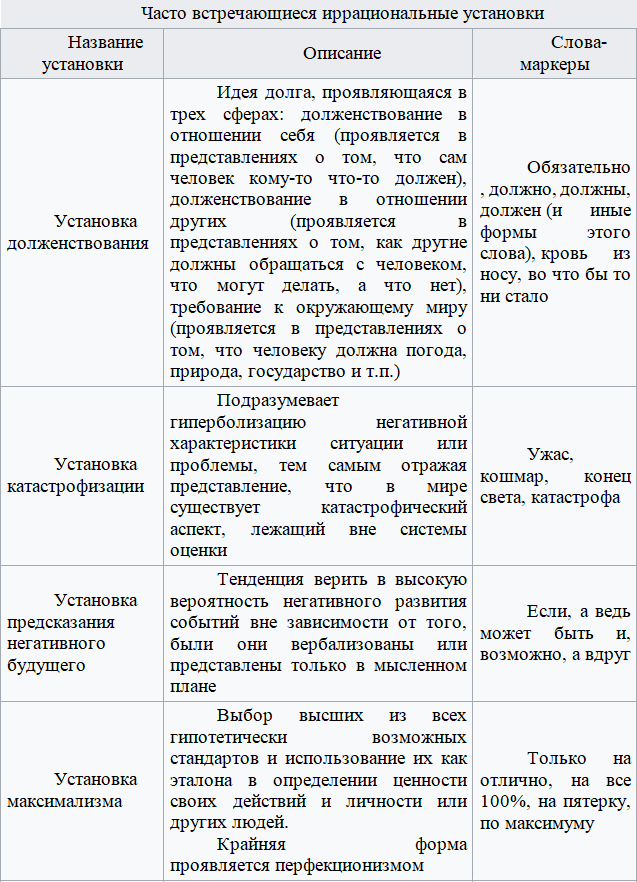 В таблице, которую я скопировал из Википедии, привожу наиболее часто встречающиеся иррациональные установки и соответствующие им слова-маркеры.