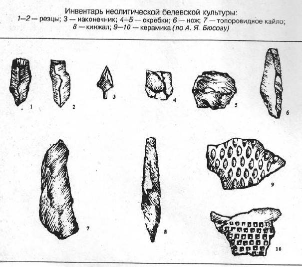 Белевская культура в Археологии – неолитическая культура, распространенная в IV–II тыс. до н. э. по верхнему течению р. Ока (район Белев – Серпухов). Древнейшая стоянка Белевской культуры – Гремячевская, против устья р. Жиздра, относится ко времени перехода от мезолита к неолиту. Для Белевской культуры типична выделка кремневых орудий из крупных ножевидных пластин. Характерны длинные и узкие кремневые кинжалы, скребки на удлиненных пластинах, наконечники стрел из пластин с частичной ретушью. В керамике – шахматный узор из ромбических вдавлений.