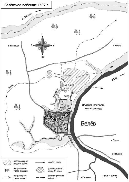 БЕЛЁВСКАЯ БИТВА – сражение между золотоордынским ханом УлуМухаммедом, изгнанным из Орды, и московской ратью под Белевом. Осенью 1437 г., потерпев поражение от сына Тохтамыша Сеид-Ахмеда, хан искал убежища на Руси. Улу-Мухаммед привел с собой отряд в 3000 сабель и «седе во граде Белеве, убежав от иного царя». Он устроил небольшую ледяную крепость («от хврастиа себе исплеть, и снегом посыпа и водою поли, и смерзеся крепко») и, решив перезимовать здесь, послал сообщить в Москву о своем прибытии. Однако Василий отправил к Белеву войско во главе с галицкими князьями – Дмитрием Юрьевичем Шемякой и Дмитрием Юрьевичем Красным. По пути эти князья «все пограбиша у своего же православного христьянства, и мучаху людей из добытка, и животину бьюще, назад себе отсылаху, а ни с чим же не разоидяхуся, все грабяху и неподобная и скверная деяху». Одновременно с ними к Белеву подошел и мценский воевода Григорий Протасьевич – подданный Литвы – с сильным отрядом. Сначала немногочисленные татары были разбиты и отброшены в город, но ворвавшиеся туда же на их плечах воеводы Петр Кузьминский и Семен Волынец были убиты, и закрепить успех русским не удалось. Улу-Мухаммед, «убоявся князей Русьскых, и начася давати им в всю волю их, и в закладе дети своя давати, и что где взяли, иде в великого князя отчине, полону, то вий отдавали и по тот день не чинити им пакости». Переговоры вели «зять царев» Елбердей и князья Усеин Сараев и Сеунь-Хозя, а с русской стороны – В. И. Собакин и А. Ф. Голтяев. Воеводы отвергли предложения хана. Полагаясь на численное превосходство своей рати они решили окончательно добить татар. 5 декабря началось новое сражение, и русские потерпели страшный разгром. Молва возложила вину за это поражение на Григория Протасьевича. Мценский воевода пошел на предательство, послав своего человека к Улу-Мухаммеду, чтобы тот уговорил хана выступить против москвичей, сказав, что хану следует напасть на них под утро. В то время как сам воевода оголит свой участок и уведет с поля боя мценский отряд.