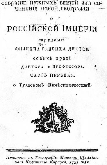 Из «Собрания нужных вещей для сочинения новой географии о РОССИЙСКОЙ ИМПЕРИИ трудами ФИЛИППА ГЕНРИХА ДИЛТЕЯ обеих прав Доктора и Профессора. ЧАСТЬ ПЕРВАЯ