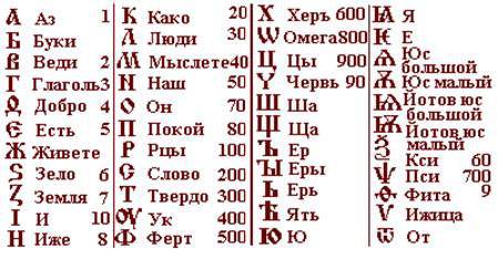 Вас может удивить, почему справа от буквы написаны цифры. Очень просто, наши пращуры цифры писали буквами. И в таблице указано, какая буква, какой цифре соответствовала. Как понять где буква, где цифра? Для обозначения цифры над буквой рисовалась черточка.