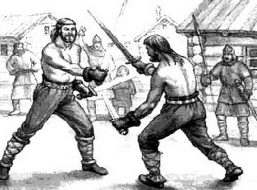 Нож. Если заточена одна грань – это нож, а если две грани, то это уже кинжал. По большому счету меч – это большой кинжал. Но мечь было очень дорогое оружие. Железа было мало и оно очень трудно доставалось. Да и технология ковки боевого ножа и меча тоже сложная. Брали полоску твердой стали, на нее с обоих строн накладывали две полоски мягкой стали и хорошо проковывали. Для чего? Если сделать меч из твердой стали, то он может быстро сломаться, из мягкой – он рубить не будет. А так мягкая сталь не дает ломаться твердой и затачивать проще. Боевой нож дорого стоил, а меч был намного дороже. Поэтому их у наших воинов было немного. Чаще у них были, в лучшем случае, засапожные мечи. Это короткий меч, которые носили за глинищем сапога. Но вы мне возразите, на всех картинах наших ратников рисуют с мечами. Правильно, нарисовать проще чем сделать.