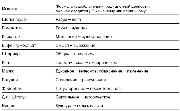 Чтобы понять тип новой гуманитарной парадигмы, которая приходит, проявляясь в резких, активных формах, надо обратить внимание на идеологическую атмосферу 1830-1840-х годов. Она характерна сознательным отталкиванием от онтологических традиций западного мышления, а в силу этого и от основных аксиом учения о разуме. Критике подвергаются в первую очередь такие допущения, как возможность при определенных условиях изменить естественную эмпирическую точку зрения и встать на точку зрения разума вообще, или абсолютного разума; возможность средствами мышления гарантировать автономию философской теории; наличие на том или ином уровне реальности объективных соответствий идеальным конструкциям разума. В качестве главного обвинения классической философии выдвигали тезис о том, что ею были забыты реальный мир и действительный индивидуум. В теориях, противостоящих классике, при всем их разнообразии была одна общая черта: объявлялось, что разум не просто отличен по своей природе от реальной действительности, но что он является ее продуктом и относительно пассивным выразителем ее внерациональных импульсов (табл. 6).