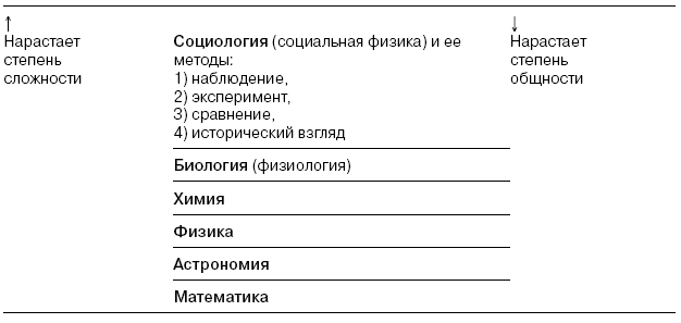 Довольно логично Конт считает ключом к успеху позитивного метода классификацию наук. В самом деле, если мы отказываемся от предпосылки мира сущностей, то единственным основанием систематизации явлений будет наш способ определения объекта и предмета исследования. Свою систему наук Конт выстраивает в соответствии с убыванием общности и возрастанием сложности предмета: математика, астрономия, физика, химия, физиология, «социальная физика» (для которой Конт изобрел название «социология»).