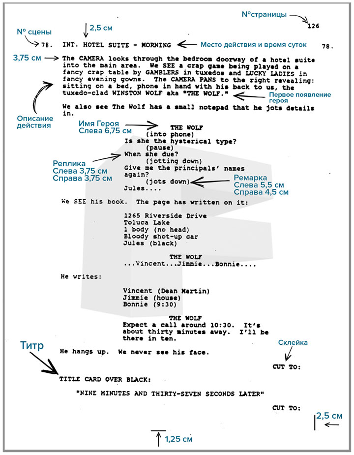 На иллюстрации пример киносценария, написанного в соответствии с общепринятыми мировыми стандартами: