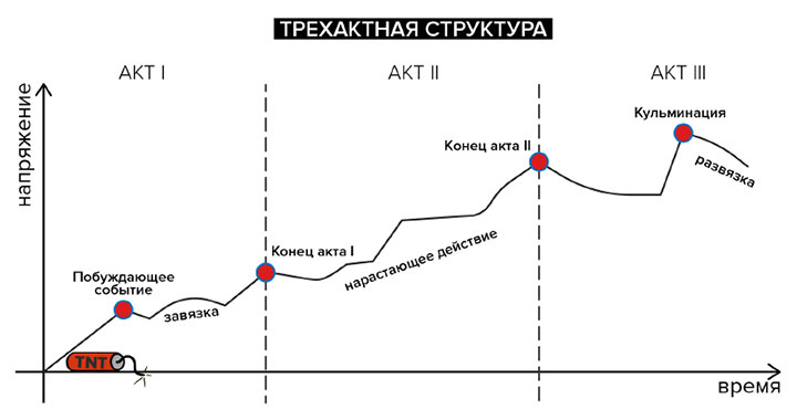 Как и в большинстве пьес, в основе классической кинодраматургии лежит трехактная структура (на иллюстрации ниже). Всегда ли она так выглядит? Нет, это всего лишь модель. В вашем фильме интенсивность действия может отличаться. Число актов же, как правило, неизменно.