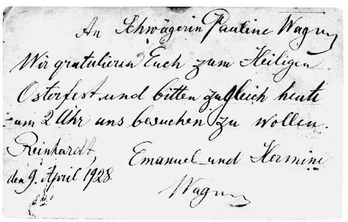 1 Приглашение на Пасху, отправленное семьей Эмануила Паулине Вагнер. Рейнгардт, 9 апреля 1928 года. Оборот приглашения на Пасху. Отправлено семьей Эмануила Паулине Вагнер. Рейнгардт, 9 апреля 1928 года.