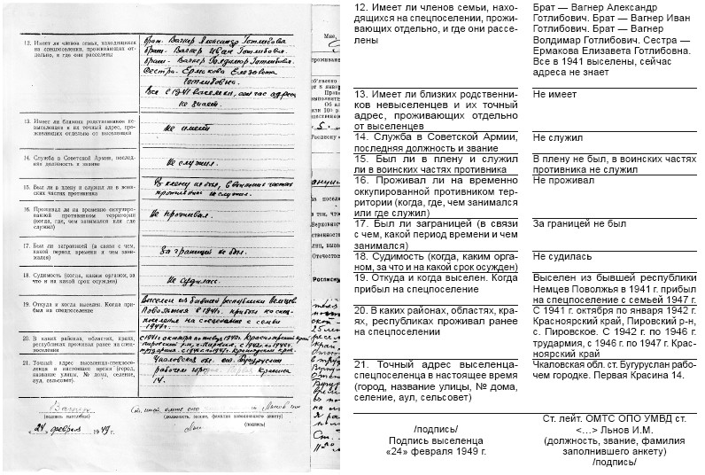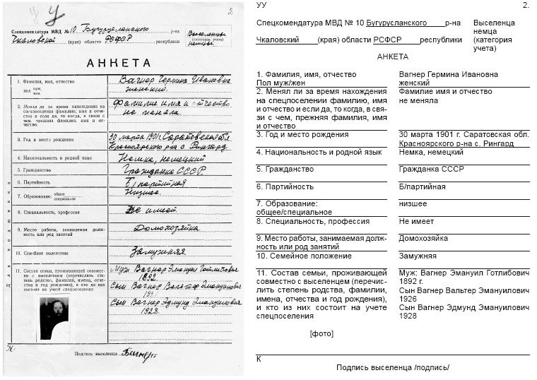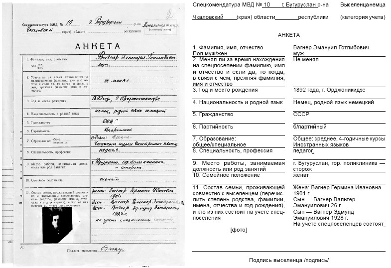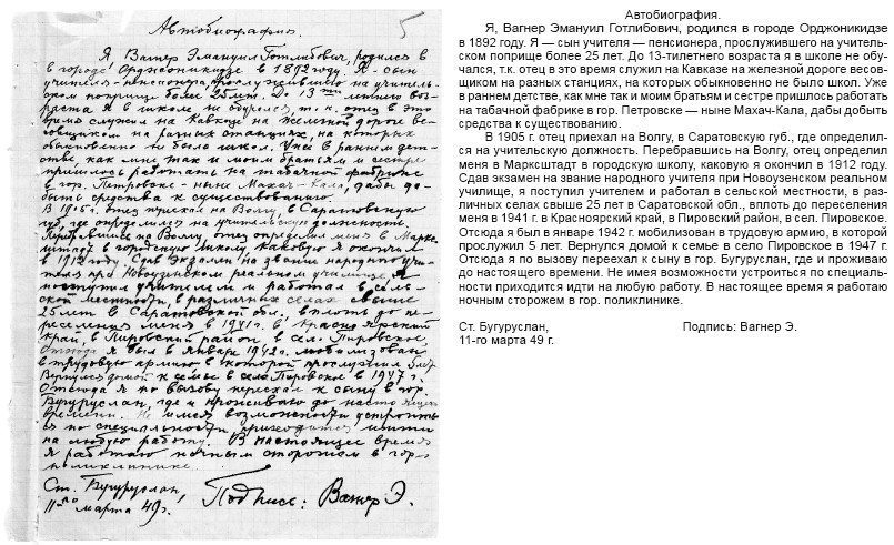 Через полтора месяца мне пришел ответ: в архиве Оренбургского УМВД есть сведения о пребывании на спецпоселении Вагнеров Эмануила, Термины, а также сыновей, Эдмунда и Вальтера. Чтобы получить эти сведения, мне необходимо выслать нотариально заверенные копии документов. Дело в том, что, когда я делаю первый запрос и не уверен в его результатах, я обычно прикладываю простые ксерокопии документов: посылать в каждом письме по несколько нотариальных копий слишком разорительно. Естественно, заверенные копии тут же были отправлены, и скоро я получил ответ: подробную архивную справку, анкеты, четыре фотографии и по две автобиографии каждого из членов семьи. Их Вагнеры писали в 1949 и 1952 годах – видимо, при какой-то перепроверке данных.