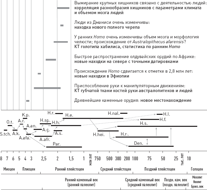 * В начале этой и семи следующих глав приведены схемы, помогающие сориентироваться в изложенных фактах и вписать их в общий контекст. Показанные на схемах интервалы существования видов, так же как и связывающие их стрелки (“кто от кого произошел”), не являются истиной в последней инстанции. Многие из них указаны очень приблизительно и предположительно. Как датировки, так и родственные связи продолжают пересматриваться и уточняться. Условные обозначения: S.tch. – Sahelanthropus tchadensis, O.t. – Orrorin tugenensis, A.k. – Ardipithecus kadabba, A.r. – Ardipithecus ramidus, K.p. – Kenyanthropus platyops, A.an. – Australopithecus anamensis, A.afa. – Australopithecus afarensis, A.g. – Australopithecus garhi, A.afr. – Australopithecus africanus, H.sp. – древнейшие представители рода Homo, Par. – парантропы (они же массивные австралопитеки), H.h. – Homo habilis, A.s. – Australopithecus sediba, H.r. – Homo rudolfensis, H.e. – Homo erectus, H.hei. – Homo heidelbergensis (в самом широком смысле), H.n. – Homo neanderthalensis, H.s. – Homo sapiens, Den. – денисовский человек, H.nal. – Homo naledi, H.f. – Homo floresiensis (“хоббиты” с острова Флорес), H.l. – Homo luzonensis (карликовые люди с острова Лусон).