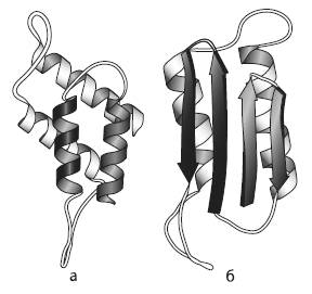 Два варианта пространственной конфигурации прионного белка: a – нормальная конфигурация (преобладают так называемые альфа-спирали); б – патологическая конфигурация (преобладают «бета-листы»). Стрелки – условные, они показывают направление от N-конца белковой молекулы (где находится аминогруппа) к C-концу (где находится карбоксильная группа).